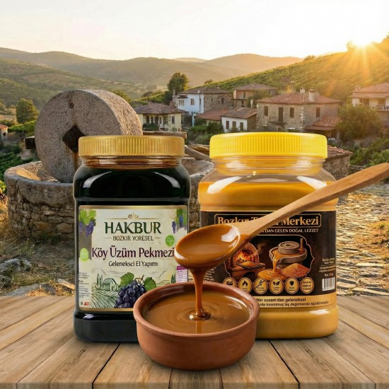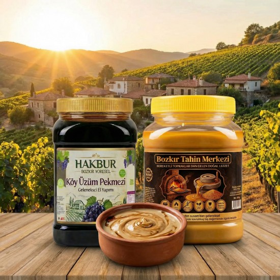 Ata tohumu Yerli Susam dan Geleneksel karafırın'da odun ateşinde kavrulmuş yöresel su değirmeninde tas da ezilerek öğütülmüştür doğal katkısız gluten içermez vegan ürün çifte kavrulmuş tahin 935 gr. Geleneksel odun ateşinde kaynatılmış yöresel katkısız ve doğal köy üzüm pekmezimiz 950 Gr ilave şeker glikoz ve fruktoz içermez tatlandırıcı içermez % 100 doğal katkısız üreticiden direkt değirmenden taze gunluk üretim