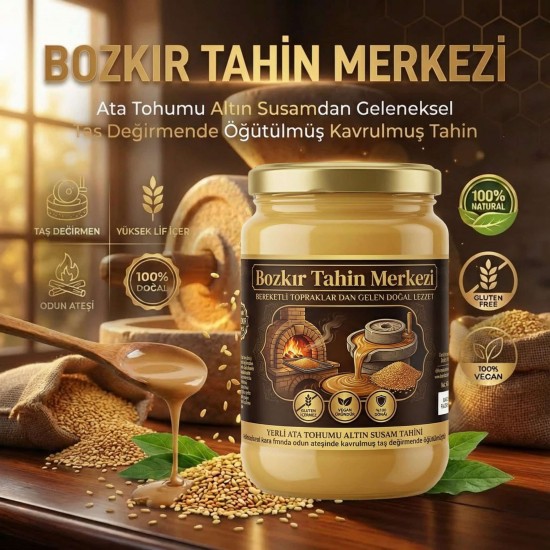 net 600 gr cam kavanoz %100 Yerli atalık altın sarı susam tanelerinin su değirmenimizde Bozkır yöremize has geleneksel kara fırında odun ateşinde kavrularak taş değirmende öğütülerek yapılmaktadır %100 yerli altın susamından üretilmekte olup, başka hiçbir koruyucu, katkı maddesi ve renklendirici içermez.