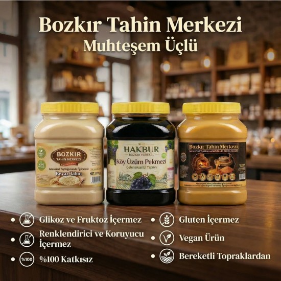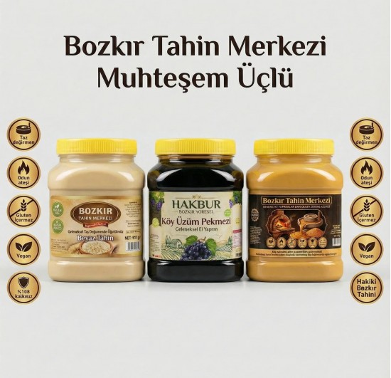 - Susamın lezzetini ve faydalarını bir arada sunan Bozkır Tahin Merkezi Üçlü Altın Susam Kavrulmuş Tahin, Taş Değirmen Beyaz Tahin ve Üzüm Pekmezi ile besleyici bir ikram.