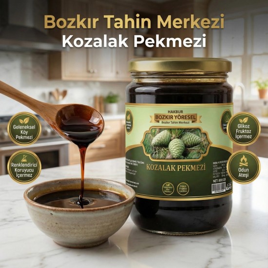 net: 800 gr % 100 doğal ev yapım geleneksel odun ateşinde servi kozalagından kaynatılarak yapılmıştır % 5 şeker içerir; Kozalak pekmezi, çeşitli kullanım alanlarına sahiptir; Doğal tatlandırıcı olarak, kahvaltılarda, tatlılarda ve içeceklerde kullanılabilir; Ayrıca, sağlıklı atıştırmalıklar yapmak veya yemeklere ekstra bir lezzet katmak için de uygundur; İsteğe bağlı olarak tahin ilave edilip de tüketilebilir; Genellikle kahvaltı sofralarımızda tükettiğimiz çam kozalağı pekmezimiz geleneksel usullerle yapılmış olup, yapay tatlandırıcı ve koruyucu madde kullanılmamıştır.; glikoz içermez Güçlü bir antioksidan kaynağı olan ve mikroplarla savaşan çam kozalağı pekmezi, özellikle alkol ve sigara tüketen kişilerin düzenli olarak tüketmeleri tavsiye edilir;